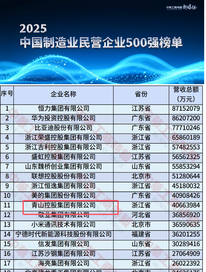 青山、振石、宏旺、甬金等上榜“2025中國民營企業(yè)500強”